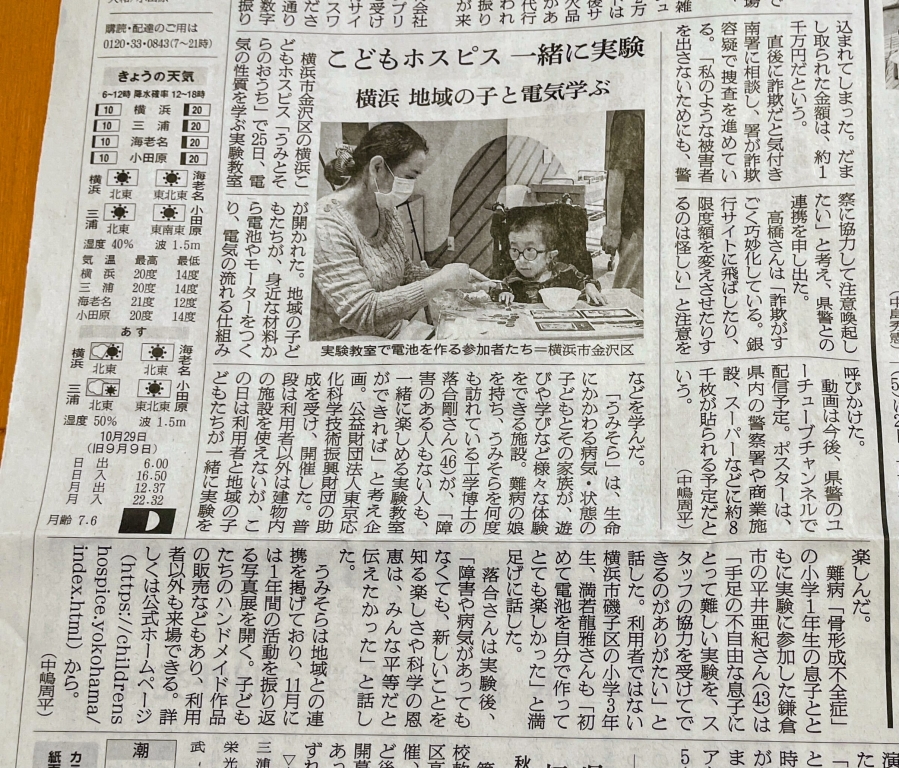 先日横浜こどもホスピス~うみとそらのおうちで開かれた、科学の実験教室の様子が