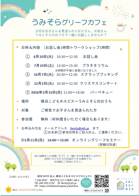 「うみそらグリーフカフェ」は、同じような経験をした仲間と一緒に手や体を動かすワークショップなどを行ないながら、お空のお子さんの話ができる場所です。