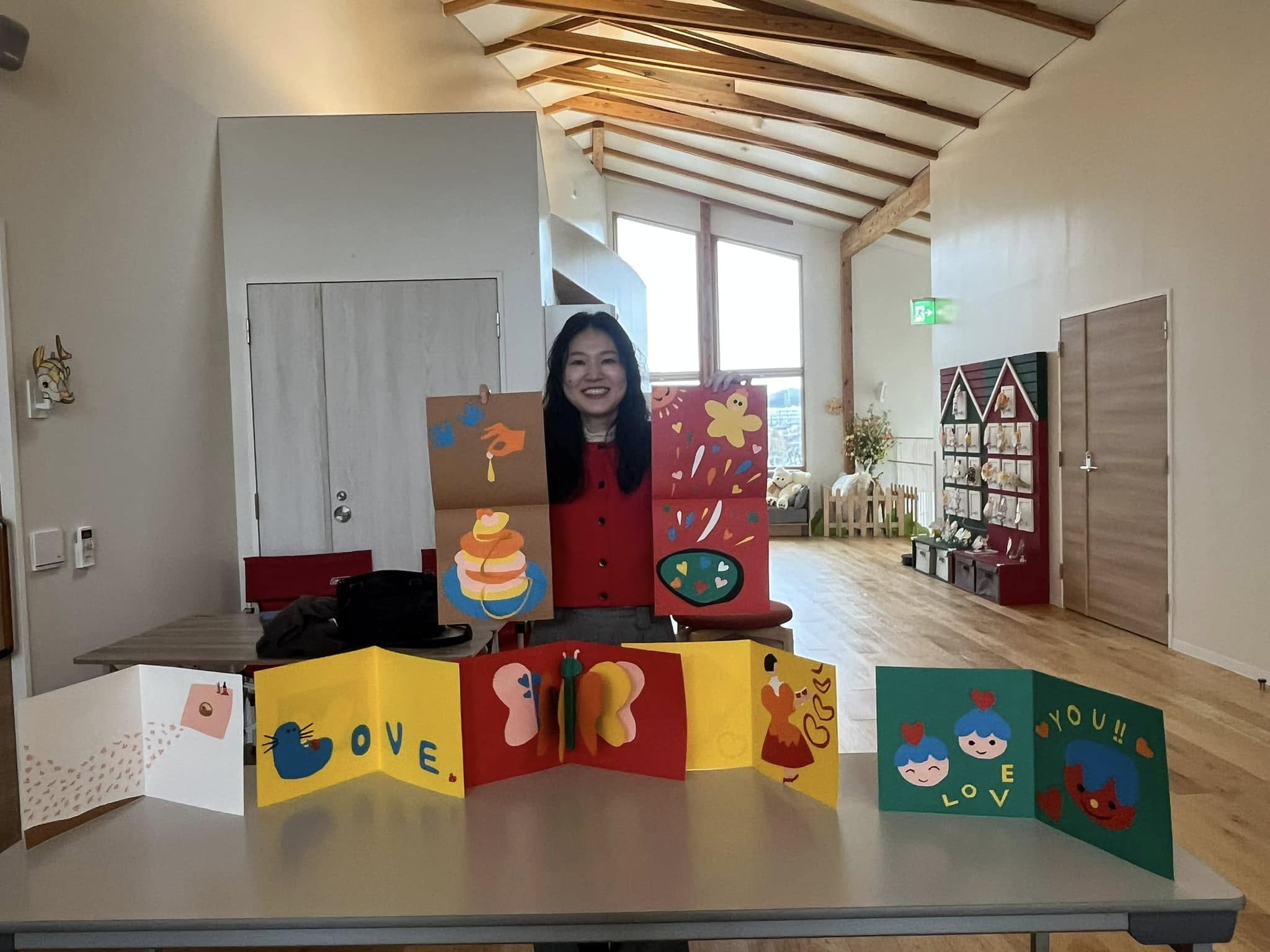今回、駒形あい先生に来ていただき、ワークショップを2階で行いました。紙とハサミを使った工作です。