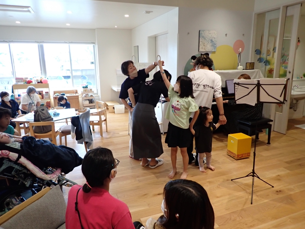 本物の楽器をプロの奏者さんが奏でるきれいな音色はこども達にも届いたようで、ソファに座って聴きいっている子もいました。伝承遊びのテーマに沿い、「むすんでひらいて」や「アルプス一万尺」など、いつもと違う素敵な演奏と共に楽しみました。オンラインで参加いただいた利用者さんとも、画面越しに演奏や手遊びなど一緒に触れ合う時間ができました。